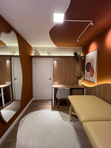 Projeto comercial desenvolvido para atendimentos terapêuticos, onde os tons terrosos trazem sensação de acolhimento e bem-estar. A marcenaria sob medida, combinada com luzes indiretas, cria uma atmosfera suave, calma e convidativa, ideal para massagens e experiências que valorizam o conforto, o equilíbrio e a tranquilidade.
